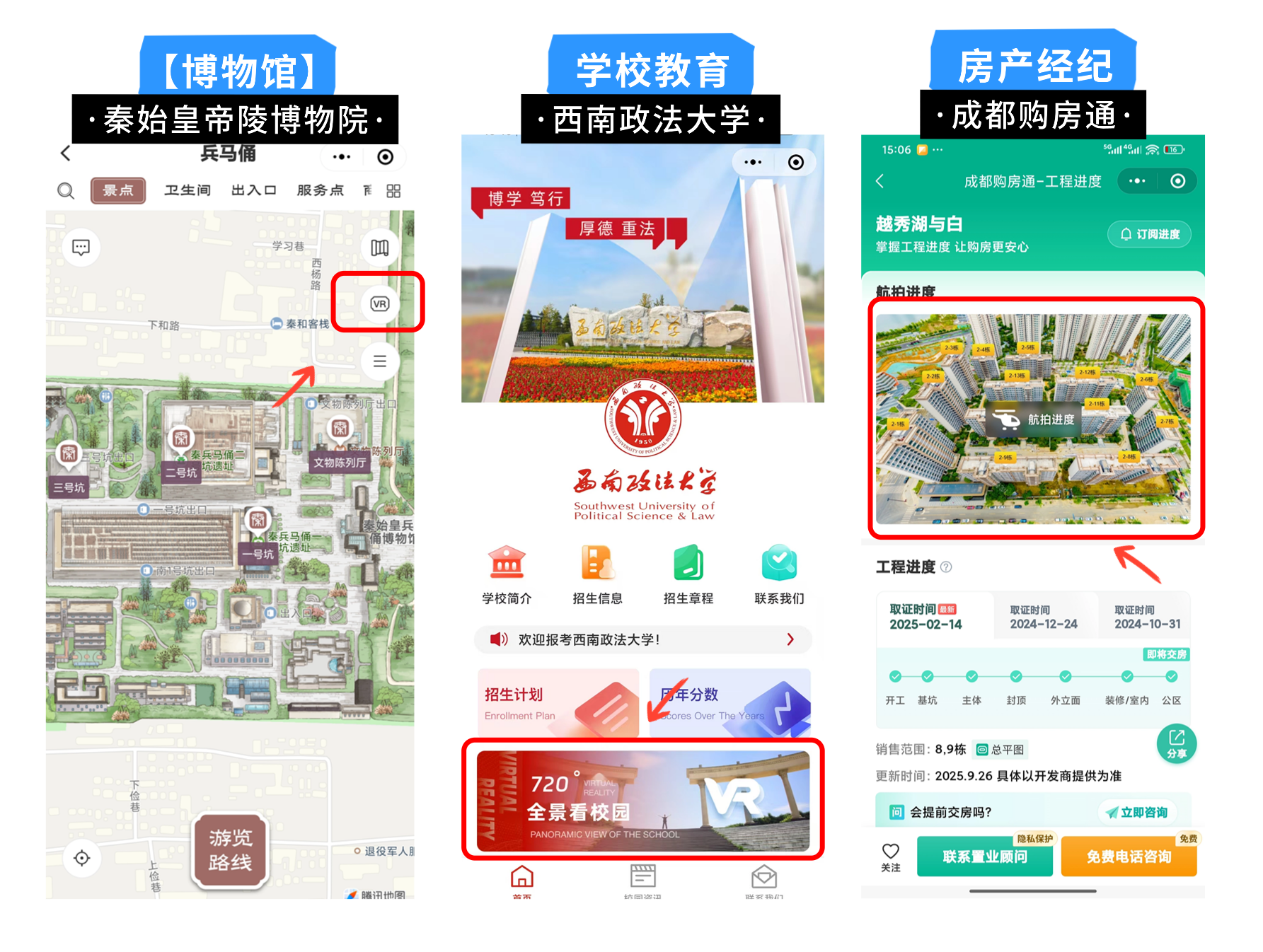微信搜索:“秦始皇帝陵博物院”、“西南政法大學(xué)”、“成都購房通”,進(jìn)入小程序即可查看VR全景。