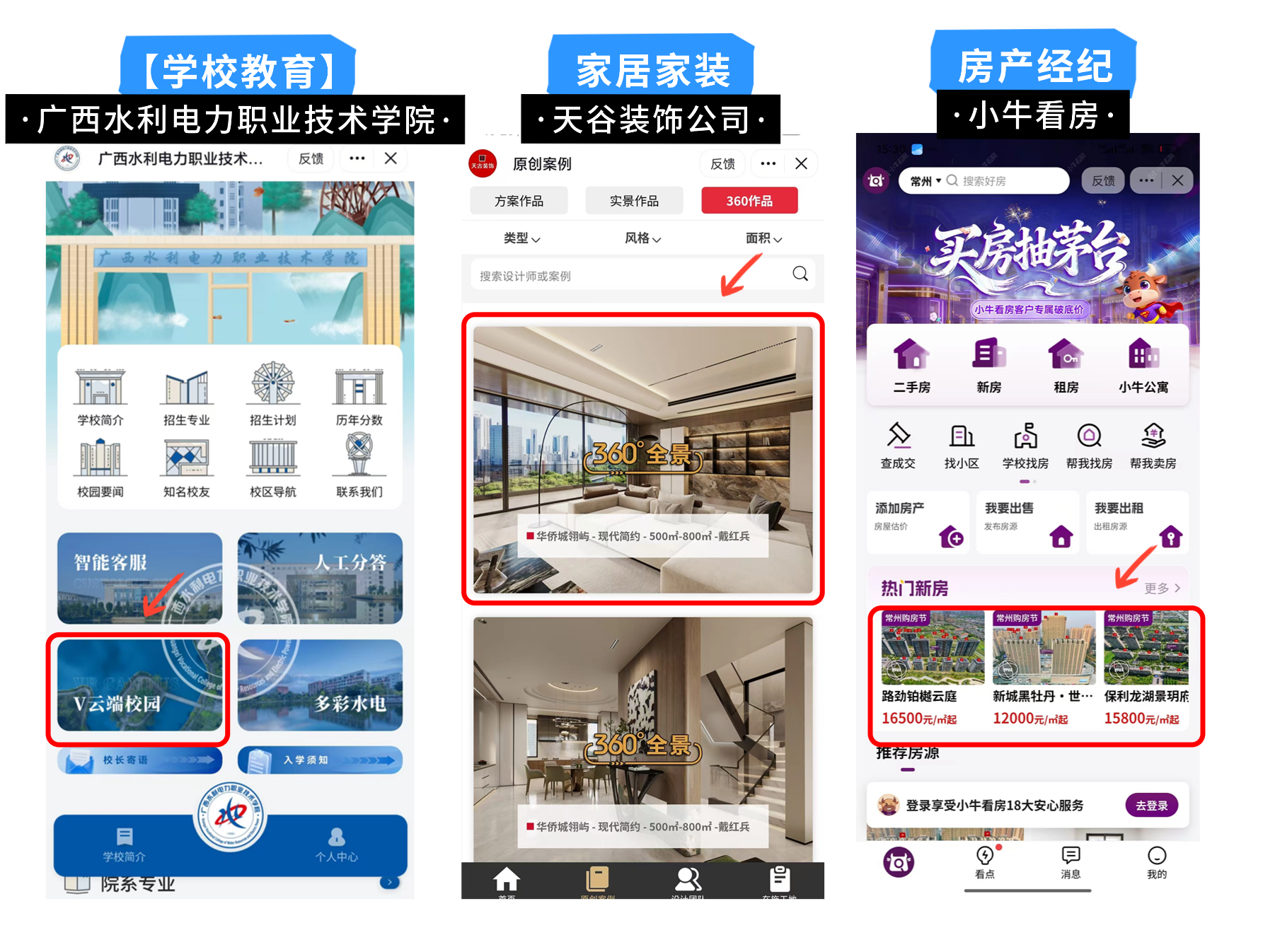 抖音搜索:“廣西水利電力職業(yè)技術(shù)學(xué)院”、“天谷裝飾公司”、“小牛看房”,進(jìn)入小程序即可查看VR全景。