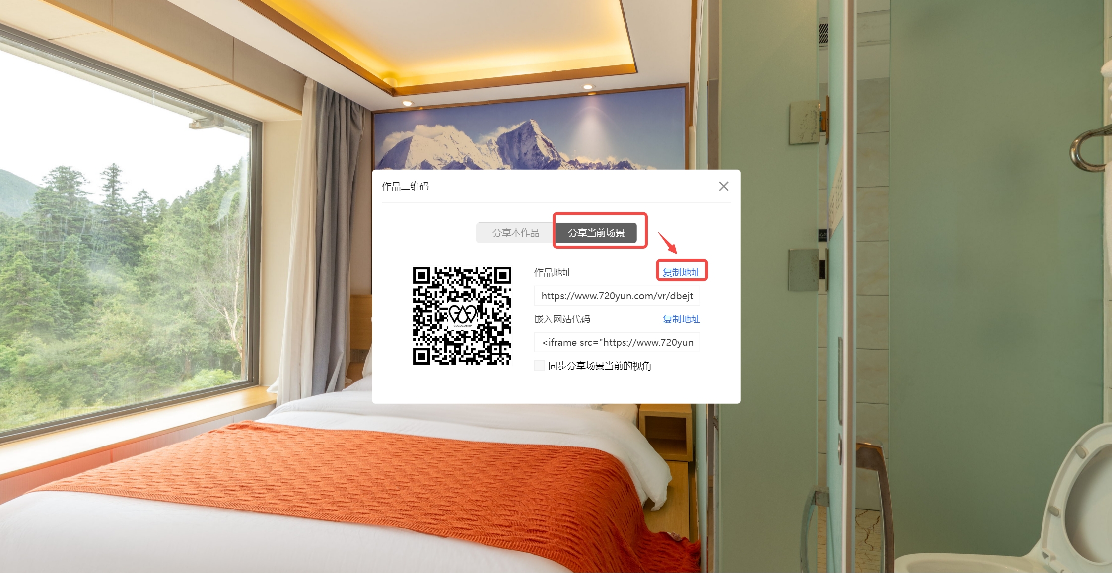 注意:客房房型鏈接,在作品中點擊“分享”——點擊“分享當(dāng)前場景”——點擊“復(fù)制地址”