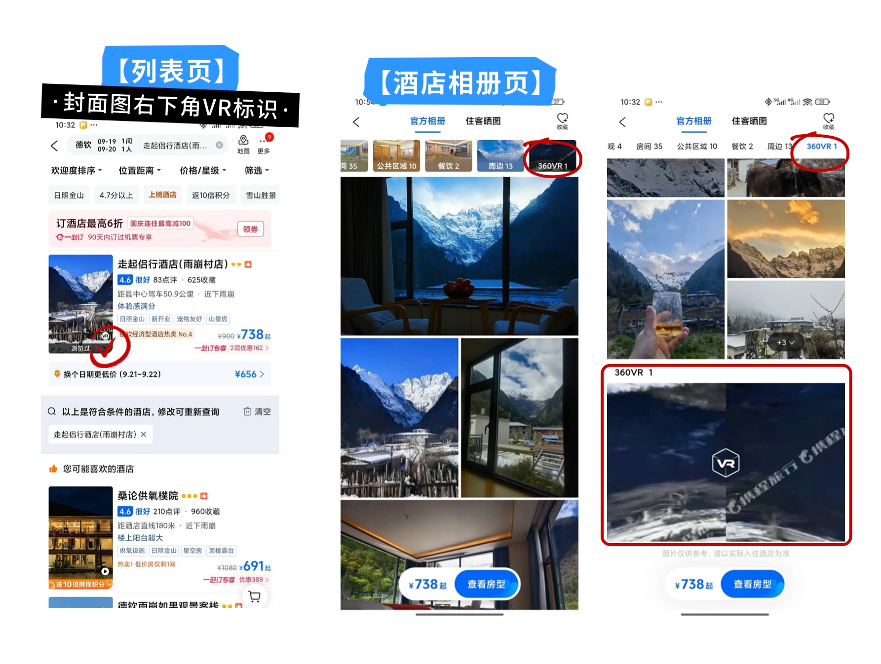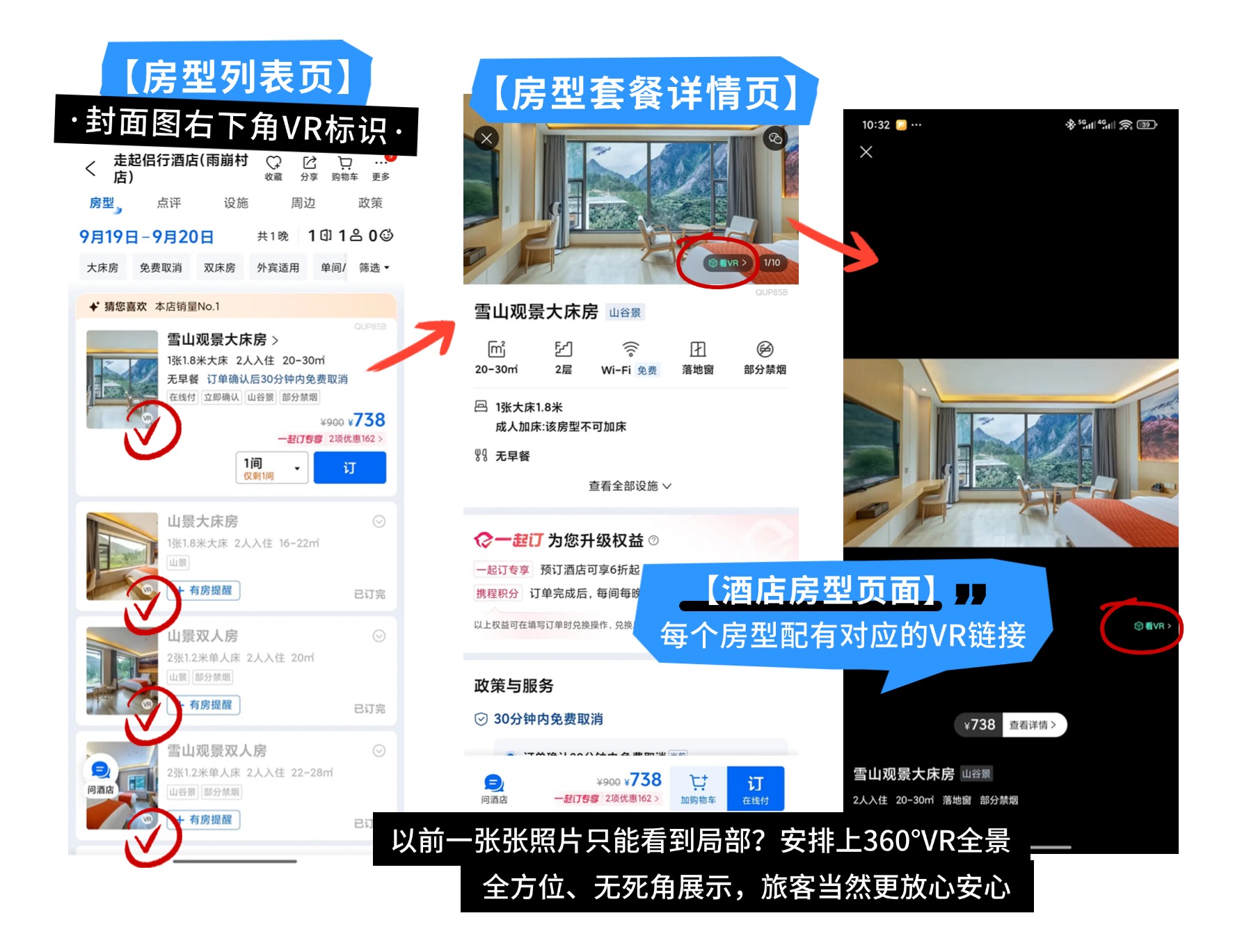 上傳成功后VR全景標(biāo)識在攜程多個界面醒目體現(xiàn)!方便潛在旅客沉浸式地感受酒店民宿全面、真實的客房環(huán)境。案例請到攜程APP搜索“走起侶行酒店(雨崩村店)”、“騰沖花溪美景溫泉客棧(和順古鎮(zhèn)店)"、“悅成國際大飯店(新亞洲體育城店)"。