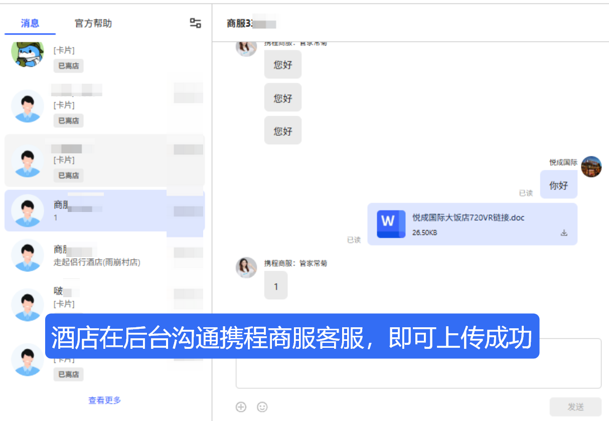 酒店在后臺溝通攜程商服客服,要求上傳酒店VR全景鏈接。